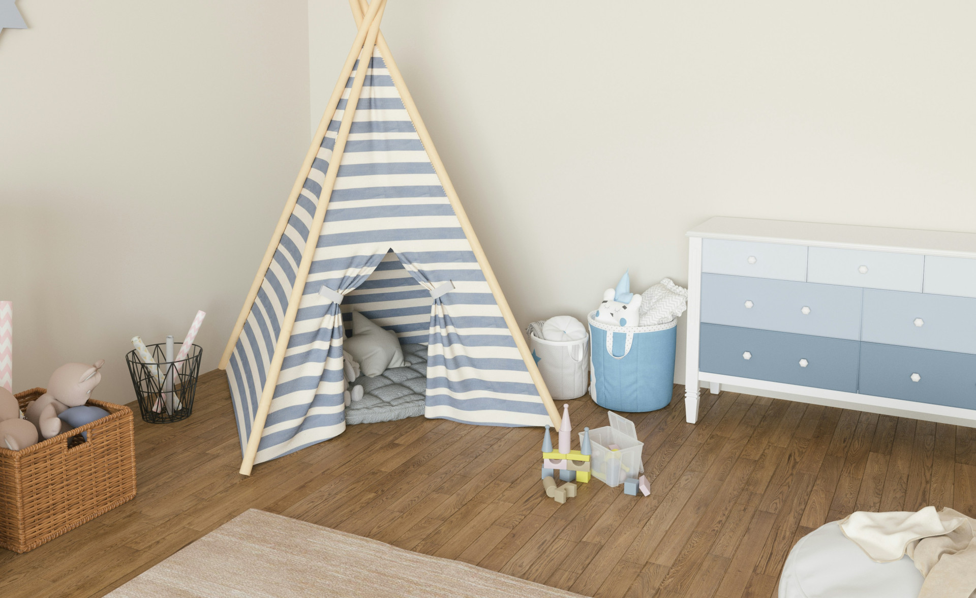 Et børneværelse skal kunne rumme mange ting – legetøj, bøger, tøj og kreative materialer. Gennemtænkt opbevaring gør en stor forskel. Brug kasser, kurve og hylder i børnehøjde, så barnet selv kan finde og lægge ting på plads. Gennemsigtige beholdere eller billeder på kasserne hjælper især mindre børn med at holde styr på sagerne.